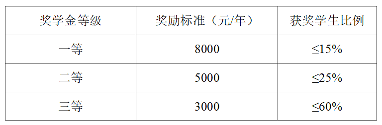 第二、第三學年“研究生學業(yè)獎學金”分為三個等級。獎勵標準及比例如下: